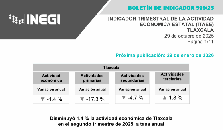 En el segundo trimestre de 2025, las actividades primarias (agricultura, cría y explotación de animales, aprovechamiento forestal, pesca y caza) reportaron un decremento anual de 17.3 por ciento. Con ello, Tlaxcala se situó en el lugar 29 a nivel nacional.