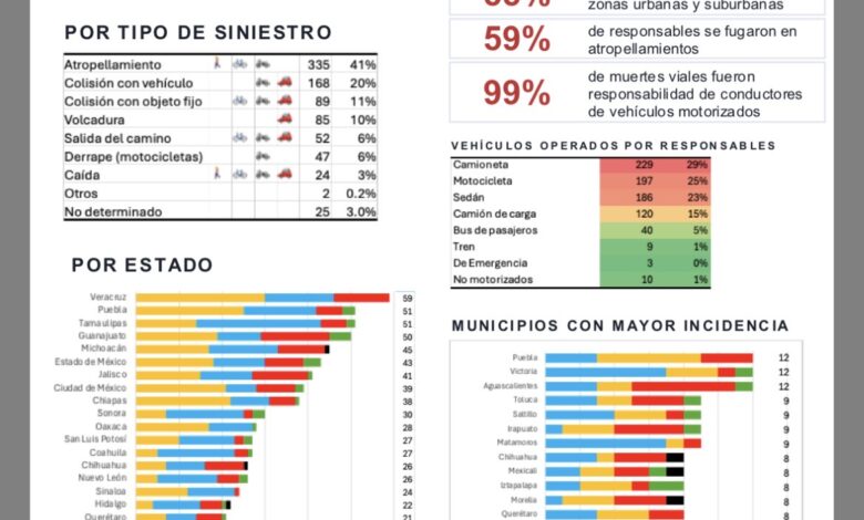 Veracruz, Puebla y Tamaulipas registraron el mayor número de muertes viales con 59, 51 y 51 casos, respectivamente.
