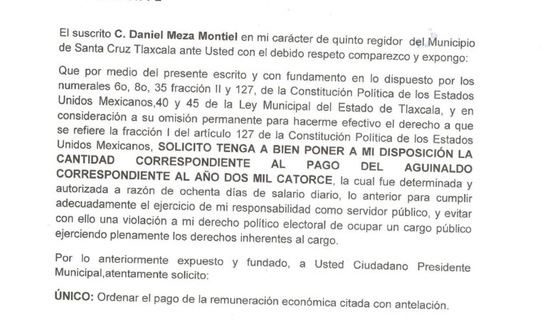 En días pasados se dio a conocer que el regidor del Partido Alianza Ciudadana (PAC), Daniel Meza Montiel, había solicitado por escrito su aguinaldo al presidente municipal de Santa Cruz Tlaxcala, Lauro Martín Hernández de los Ángeles, consistente en dos años, es decir, 2014 y 2015, pero se demostró que el primero sí cobro este concepto.