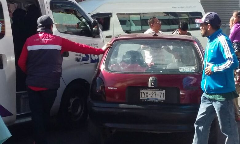 La mañana de este domingo se suscitó un accidente vehicular en el que estuvieron involucrados una combi de la ruta Santa Ana-Tlaxcala y un Chevy, sin que resultaran heridos, tanto pasajeros como la familia afectada.