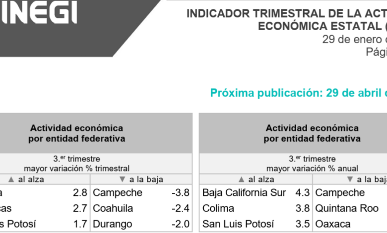 Durante el tercer trimestre de 2025 y con cifras ajustadas por estacionalidad, las entidades federativas que registraron los mayores crecimientos en su actividad económica, a tasa trimestral, fueron Tlaxcala, con 2.8 %; Zacatecas, con 2.7 %; San Luis Potosí, con 1.7 %; Veracruz, con 1.4 %; y Colima y Yucatán, con 1.3 por ciento.