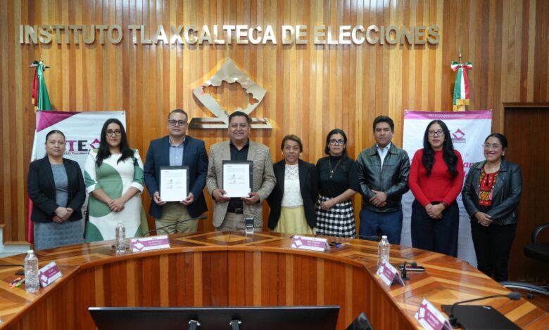 Por ello, el colegiado del ITE recibió este martes a los presidentes municipales de Tetla de la Solidaridad, Giovani Montiel López; de Tzompantepec, Marcelino Ramos Montiel; y de Teolocholco, Valentín Meléndez Tecuapacho, acompañado de la Síndica, Lilia Salamanca Xicohtencatl, quienes firmaron el documento.