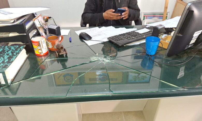 Al continuar el presidente defendiendo las tradiciones comunitarias, el ex policía reaccionó de forma violenta, rompiendo varios vidrios del inmueble de la presidencia, así como cristales de escritorios, causando daños materiales.