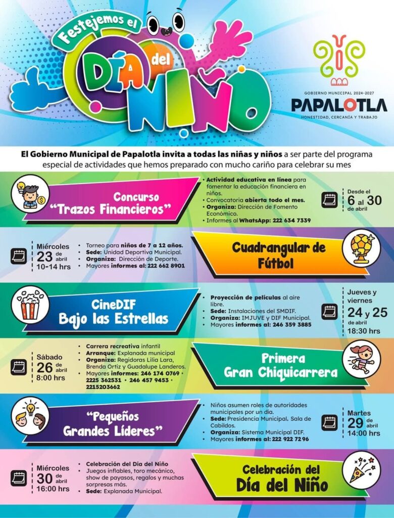 Con el firme compromiso de impulsar acciones que estimulen la capacidad, creatividad y habilidades de la niñez en distintas áreas, el gobierno municipal de Papalotla, encabezado por el presidente municipal Sergio Lara, realiza un amplio programa de actividades para celebrar el Día del Niño y la Niña durante todo el mes de abril, promoviendo el desarrollo cultural, deportivo y educativo de los menores.