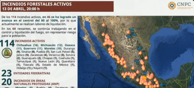 La funcionaria federal indicó que la mayoría de incendios activos se ubicaron en Chihuahua, Michoacán, Oaxaca, Morelos y Guerrero, mientras que en menor incidencia en otros 18 Estados del país.