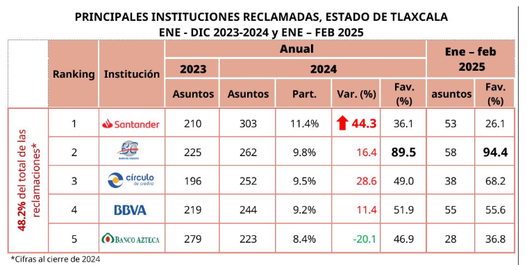 En 2024 se logró recuperar un monto de 10.5 millones de pesos, lo que significó 60.4% menos que en 2023. En los dos primeros meses de 2025 se han recuperado 1.9 millones de pesos. Los productos más reclamados fueron el reporte de crédito especial, la tarjeta de débito y la tarjeta de crédito, que en conjunto representaron el 50.2% del total en esa entidad.