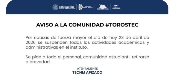 Los mensajes amenazantes aparecieron durante la mañana de este jueves y fueron localizados al inicio de clases, por lo que, en el caso del Tec de Apizaco, las actividades fueron suspendidas y se desalojó a alrededor de mil estudiantes como medida preventiva, lo cual fue notificado a través de las redes sociales de la propia institución de educación superior.