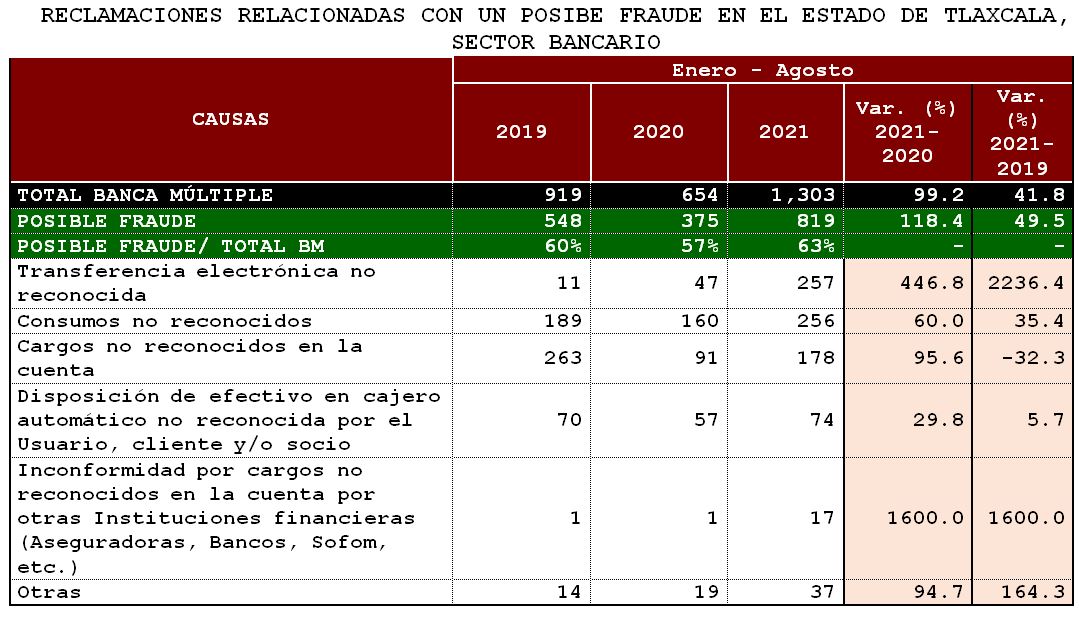 Las principales causas de reclamación fueron las relacionadas con los Consumos no reconocidos, Transferencia electrónica no reconocida y los Cargos no reconocidos en la cuenta, que en conjunto representaron el 34% del total de las reclamaciones presentadas en dicha entidad. Es importante mencionar que la CONDUSEF ha identificado causas de reclamo que están relacionadas con un posible fraude, principalmente en el sector bancario; y en el estado de Tlaxcala, del total de reclamaciones presentadas en contra de los bancos, el 63% estuvieron relacionadascon un posible fraude, fundamentalmente originadas por llamadas telefónicas que supuestamente hace el banco, acceso a páginas apócrifas y en cajeros automáticos. Al respecto, destaca el incremento de estos asuntos por las transferencias electrónicas y los Consumos no reconocidos, por ello es muy importante que las y los usuarios no den información por teléfono (muchas veces a través de llamadas supuestamente de su banco), no accedan a páginas que les llegan a través de redes sociales o den sus claves o datos personales, si no iniciaron ellos mismos algún tipo de consulta.