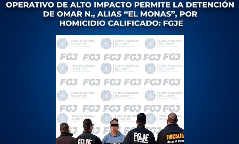 La Fiscalía General de Justicia del Estado (FGJE) y la Fiscalía General de Justicia del Estado de México (FGJEM) lograron la detención, mediante una colaboración institucional, de Omar N., alias “El Monas”, considerado un objetivo relevante por su presunta participación en el delito de homicidio calificado en territorio mexiquense.