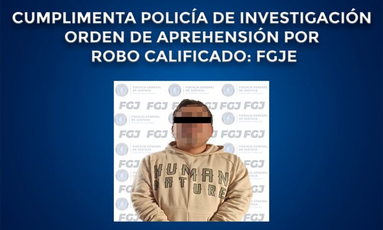 La Fiscalía General de Justicia del Estado (FGJE), a través de la Policía de Investigación, cumplimentó una orden de aprehensión en contra de Jorge Iván N., por su probable responsabilidad en el delito de robo calificado.