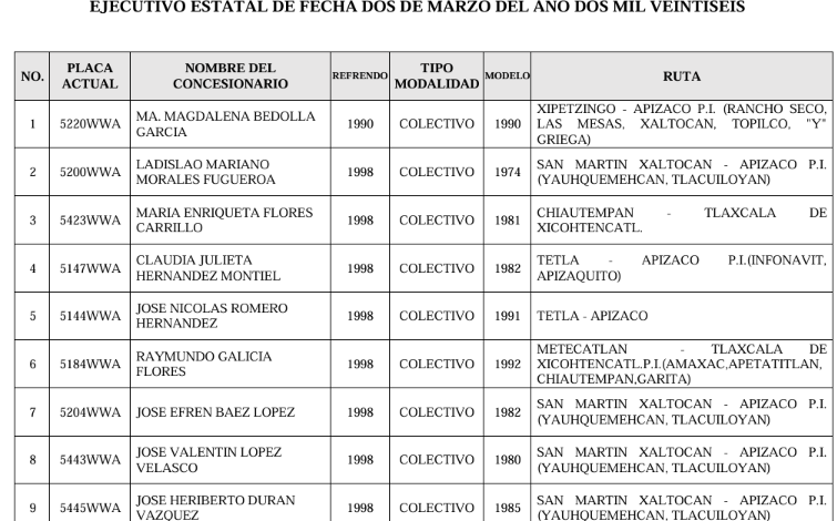 Se trata del cuarto Acuerdo de ese tipo publicado en el Periódico Oficial de Tlaxcala, mediante los cuales la SMyT ha cancelado en definitiva diferentes concesiones de transporte público, por el mismo motivo de mantener adeudos con el Estado.
