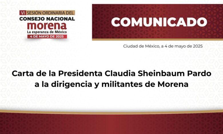 Carta de la Presidenta Claudia Sheinbaum Pardo a la dirigencia y militantes de Morena