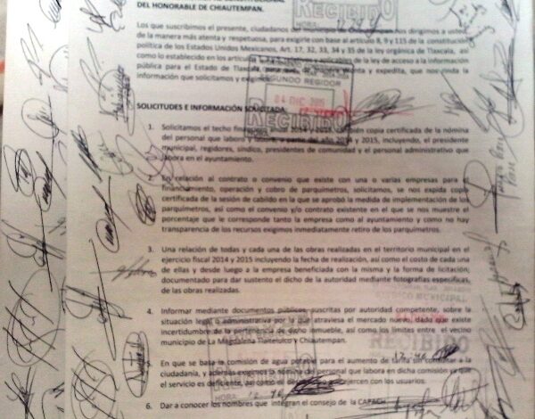 Ciudadanos representativos del centro de Chiautempan se organizaron y entregaron una solicitud al presidente municipal de Chiautempan, Antonio Mendoza Romero, con el objetivo de conocer varias situaciones de la administración pública, desde la nómina completa y hasta los contratos o convenios que existe con la empresa Copemsa de parquímetros.