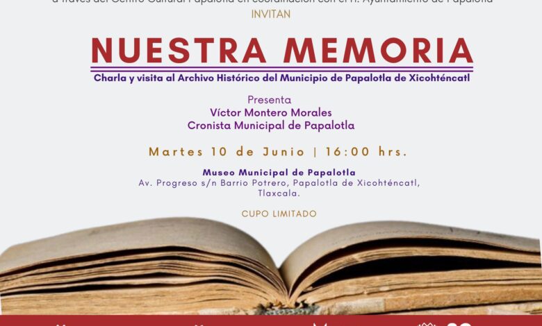 Para dar a conocer los documentos y registros que conforman la memoria colectiva del municipio, el Gobierno Municipal de Papalotla 2025, en colaboración con la Secretaría de Cultura estatal y la Dirección de Extensión Cultural, ha organizado una charla y visita especial al Archivo Histórico del Municipio bajo el nombre “Nuestra Memoria”.