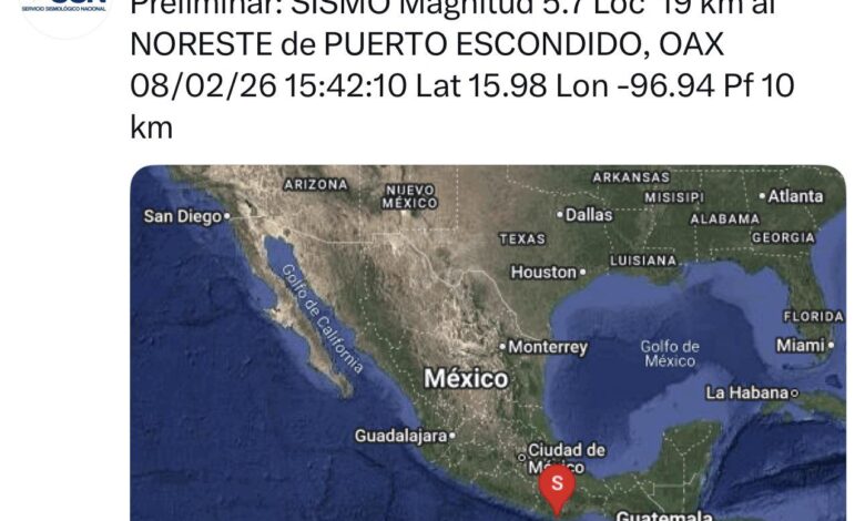 El Servicio Sismológico Nacional informa de manera preliminar la ocurrencia de un sismo de magnitud 5.7, localizado a 19 kilómetros al Noreste de Puerto Escondido, Oaxaca.