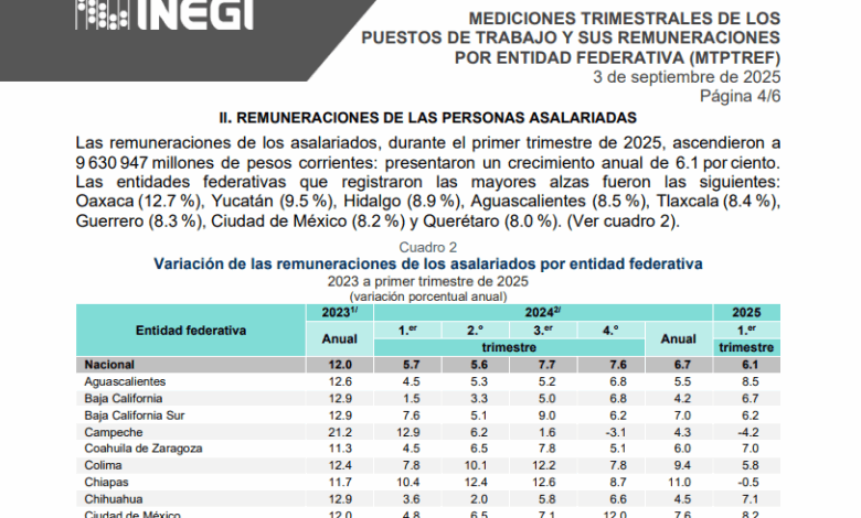 A nivel nacional y a través del primer trimestre de 2025, las remuneraciones de los asalariados ascendieron a 9 mil 630 millones 947 mil pesos corrientes, lo que significó un crecimiento anual de 6.1 por ciento.