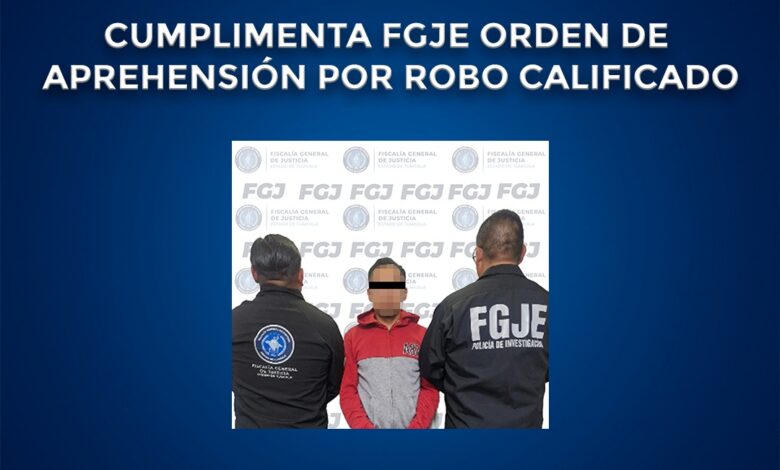 La Fiscalía General de Justicia del Estado (FGJE), en coordinación con la Fiscalía General del Estado de Puebla (FGE), cumplimentó una orden de aprehensión en contra de Oliver N., por el delito de robo calificado.