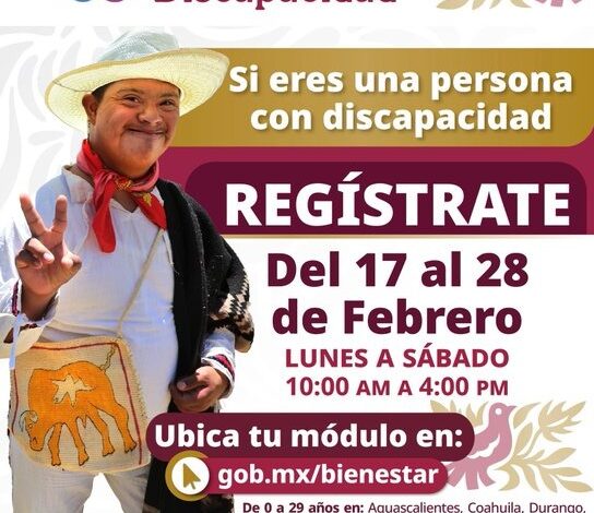 La secretaria de Bienestar, Ariadna Montiel Reyes, informó que, del 17 al 28 de febrero, las personas con discapacidad de 0 a 64 años son bienvenidas al registro para la Pensión para el Bienestar de las Personas con Discapacidad; mientras que en los estados de Aguascalientes, Coahuila, Durango, Guanajuato, Jalisco, Nuevo León y Querétaro, la inscripción es para personas de 0 a 29 años.