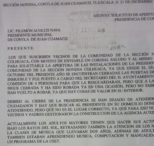 A través de un documento con copia a diputados del Congreso del estado, vecinos de la Sección Novena del municipio de Contla, mejor conocida como Colhuaca, demandaron al alcalde Filemón Acoltzi Nava, su intervención para la reapertura inmediata de la presidencia de comunidad que se mantiene cerrada desde hace más de dos meses, lo que ha generado desatención a la ciudadanía y riesgo de que la paz social se altere.