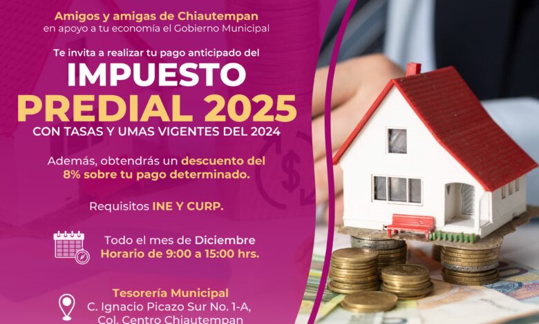 En apoyo a la economía de las familias, la Presidencia Municipal de Chiautempan puso en marcha el cobro anticipado de predial 2025 con tarifas y precios vigentes de 2024, además de un 8 por ciento de descuento, si se paga durante el mes de diciembre.