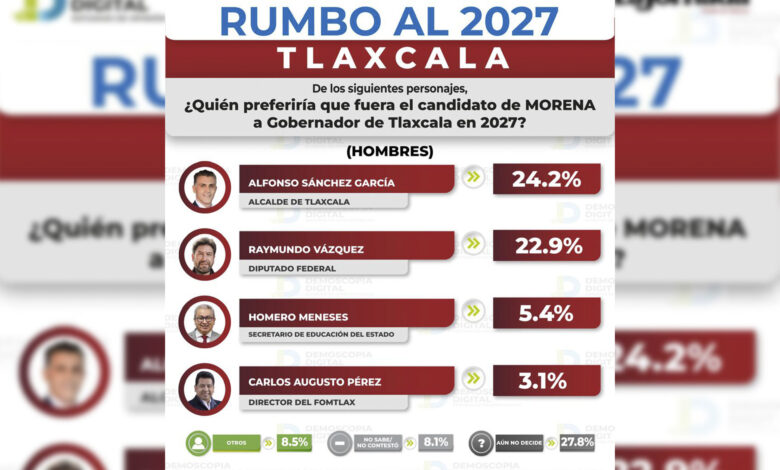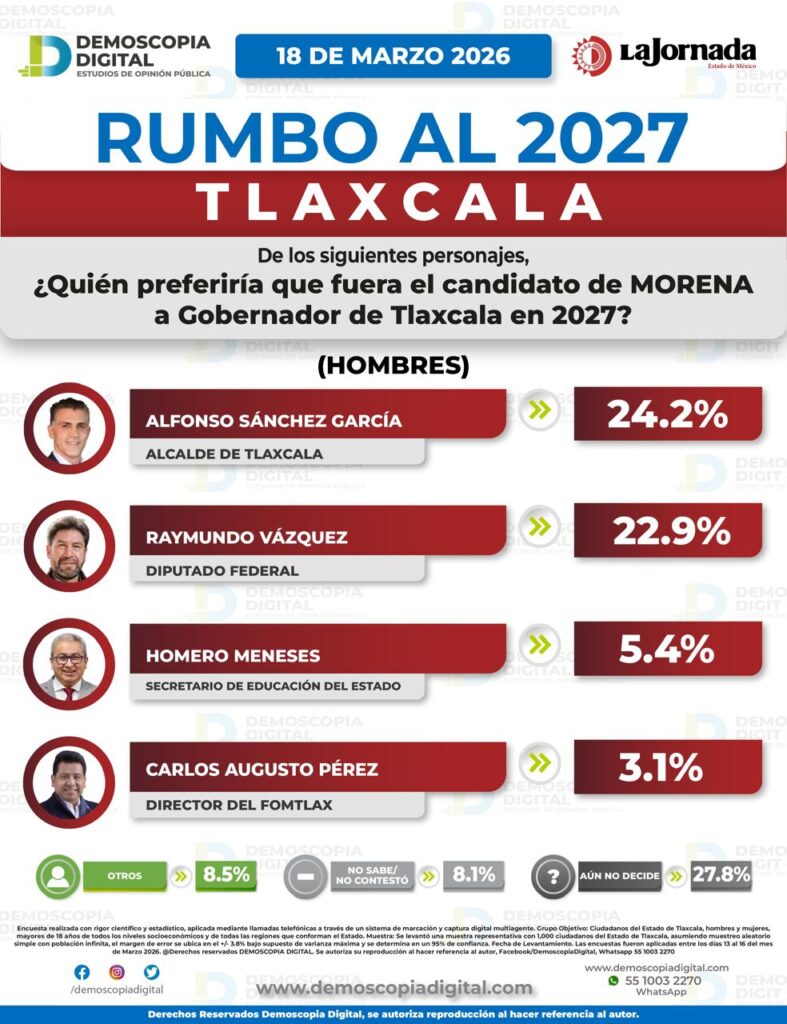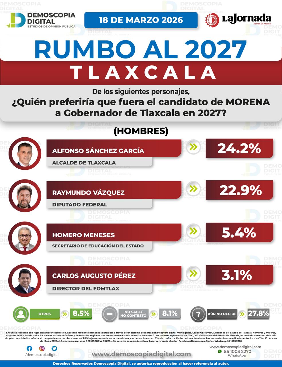 El Diputado Federal, Ray Vázquez Conchas, sigue creciendo en la preferencia para lograr la candidatura de Morena al gobierno de Tlaxcala en 2027, mientras que el alcalde de la capital, Alfonso Sánchez García, continúa con la mala racha, pues de febrero a marzo solo creció un punto porcentual.