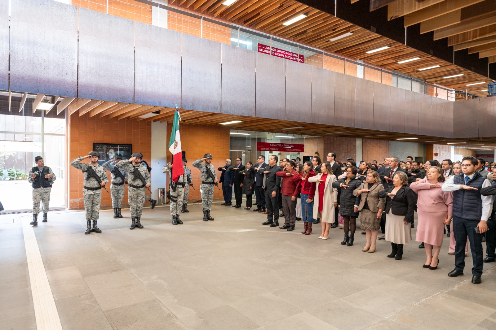 Así lo manifestó durante su mensaje en el homenaje al Lábaro Patrio que se efectuó en las instalaciones de Ciudad Judicial, en el que destacó el trabajo que magistradas, magistrados, consejeras, consejeros, juezas, jueces, así como las y los servidores públicos del Poder Judicial de Tlaxcala realizan desde sus respectivas áreas de trabajo.