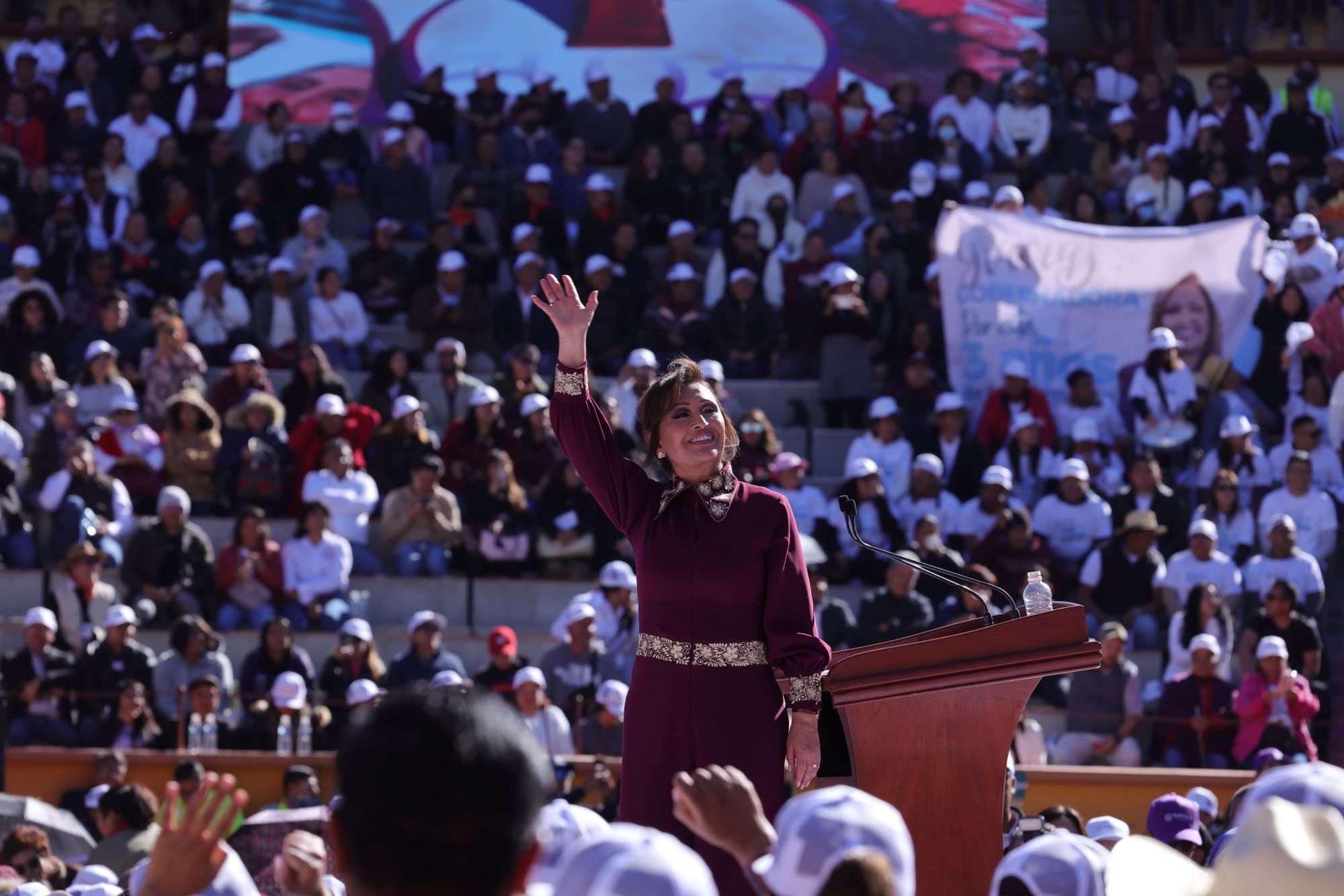 “Te queremos, Lorena; te queremos”, corearon miles de tlaxcaltecas en la monumental plaza de toros, Rodolfo Rodríguez “El Pana”, clamor que fue respondido repetidamente por la gobernadora con la frase “yo también los quiero” durante su segundo mensaje ciudadano con motivo del Tercer Informe de Gobierno.