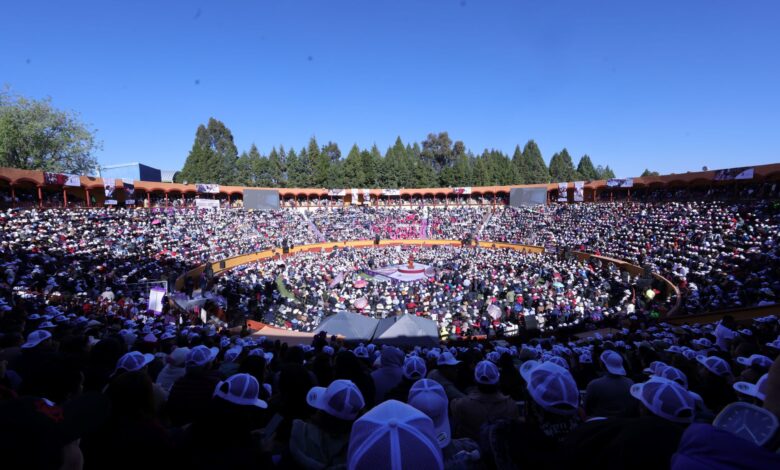 Conviven tlaxcaltecas con la gobernadora Lorena Cuéllar en la plaza de toros de Apizaco; la reciben con porras, abrazos y felicitaciones por su Tercer Informe de Gobierno