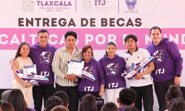 La gobernadora Lorena Cuéllar Cisneros, acompañada de la directora general del Instituto Tlaxcalteca de la Juventud (ITJ), Lucero Morales Tzompa, y del presidente municipal de Tlaxcala, Alfonso Sánchez García, encabezó la entrega de 200 becas a jóvenes del programa de Movilidad Internacional “Tlaxcaltecas por el Mundo” en su tercera edición.