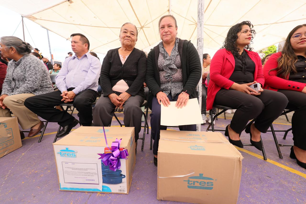 Como parte del evento, la gobernadora Lorena Cuéllar entregó simbólicamente insumos como parrillas, vajillas, baterías de cocina, mesas, cobertores, planchas y licuadoras a mujeres beneficiadas, los cuales tendrán un impacto positivo en los hogares y espacios comunitarios.