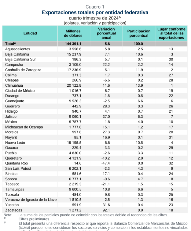 En el cuarto trimestre del año pasado, el valor global de las exportaciones de los 32 Estados alcanzó un monto de 144 mil 391.1 millones de dólares