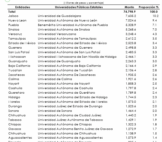 El presupuesto que la Federación destinó a 35 universidades e institutos del país en el presente año fue de 74 mil 798. 9 millones de pesos, cuyos mayores montos fueron dirigidos a las universidades Autónoma de Guadalajara con 7 mil 635 millones, la Autónoma de Nuevo León con 7 mil 24, la Benemérita de Puebla con 5 mil 328 y la Autónoma de Sinaloa con 5 mil 268 millones de pesos.
