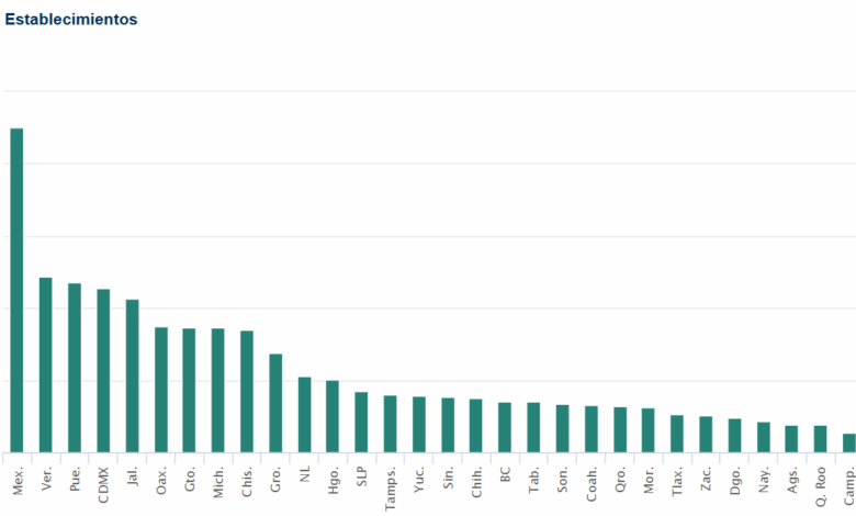 Los Estados de México, Veracruz, Puebla, Ciudad de México, Jalisco, Nuevo León y Guanajuato son los que concentran el mayor número de establecimientos y empleados, mientras que la capital del país, junto con Nuevo León, Baja California, Chihuahua y Tamaulipas son las que ofrecen mejores ingresos anuales desde 180 mil 963 hasta los 242 mil 393 pesos.