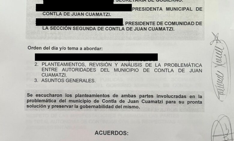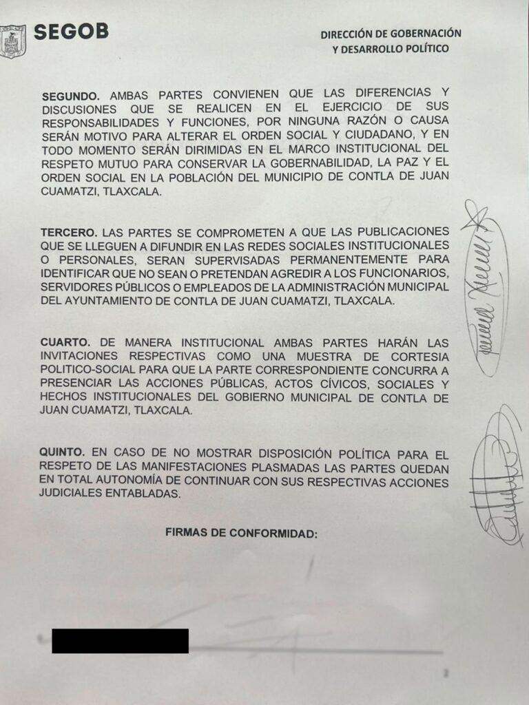 El acuerdo fue firmado por ambas autoridades y por el mediador designado por la Secretaría de Gobierno del Estado, lo que marcó el cierre formal del conflicto suscitado el pasado 6 de agosto, con este resultado, se busca fortalecer la gobernabilidad municipal y sentar las bases para una convivencia institucional más estable y respetuosa en Contla de Juan Cuamatzi.