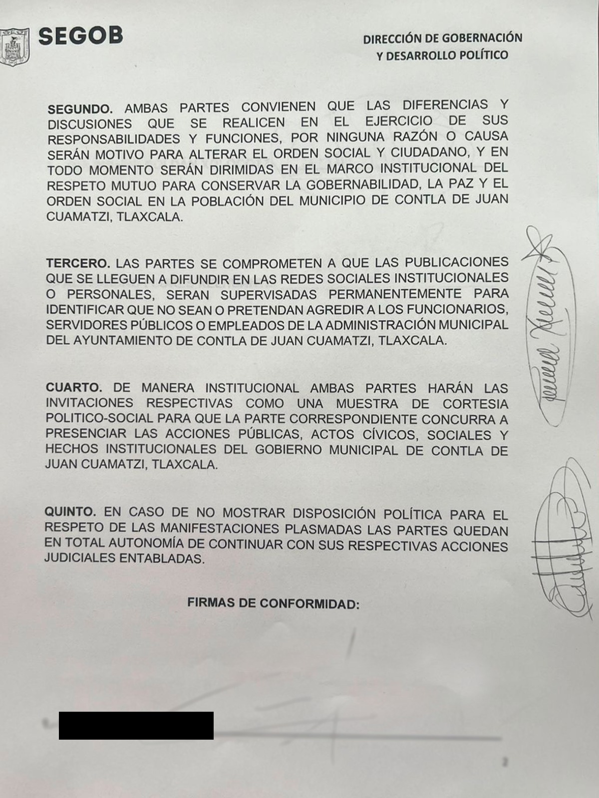 Como parte de los acuerdos alcanzados, ambas partes se comprometieron a tratar con respeto al personal de sus respectivas instancias y a actuar en estricto cumplimiento de la Ley Municipal del Estado de Tlaxcala, se acordó expresamente abstenerse de realizar manifestaciones que impliquen amenazas, desacreditaciones, acciones que puedan generar confrontaciones o ingobernabilidad.