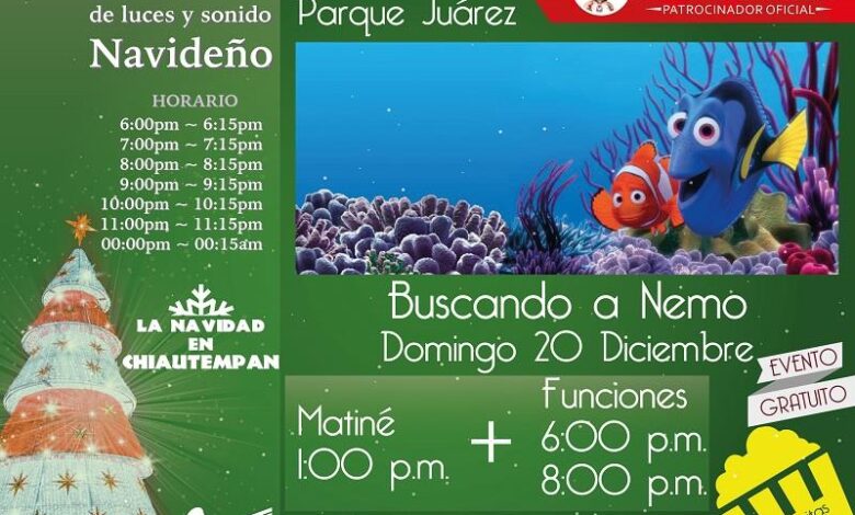 Como parte de las actividades programadas para “La navidad en Chiautempan”, el ayuntamiento de Chiautempan y Grupo textil Providencia invitan al público en general a acudir hoy domingo 20 de diciembre a la proyección de la película “Buscando a Nemo” como parte del ciclo de películas de Disney que se estarán presentando a un costado del Parque Juárez de la ciudad Chiautempense todos los días de manera gratuita en horarios de 6:00 p.m. y 8:00 p.m. y fines de semana una matiné adicional a las 13:00 Hrs.