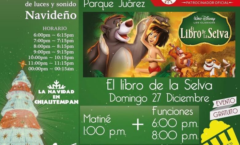 Cmo parte de las actividades programadas para “La navidad en Chiautempan”, el ayuntamiento de Chiautempan y Grupo textil Providencia invitan al público en general a acudir hoy domingo 06 de diciembre a la proyección de la película “El libro de la selva” como parte del ciclo de películas de Disney que se estarán presentando a un costado del Parque Juárez de la ciudad Chiautempense todos los días de manera gratuita en horarios de 6:00 p.m. y 8:00 p.m. y fines de semana una matiné adicional a las 13:00 Hrs.
