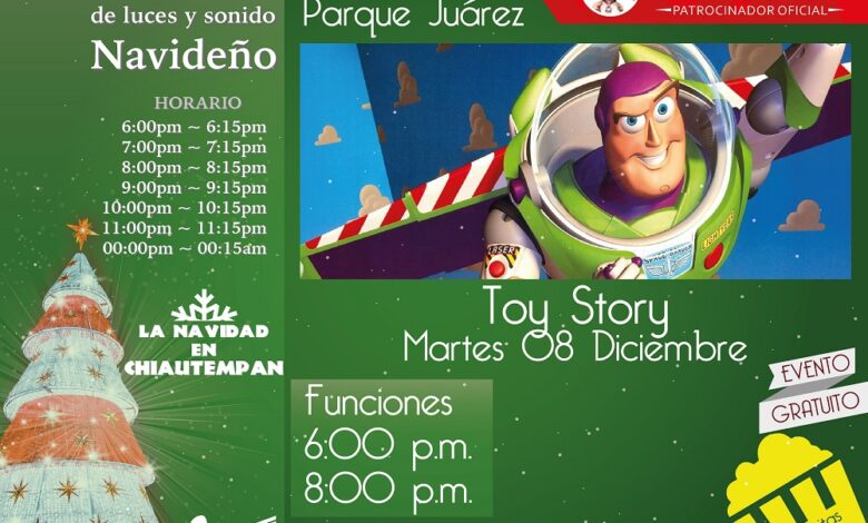 Como parte de las actividades programadas para “La navidad en Chiautempan”, el ayuntamiento de Chiautempan y Grupo textil Providencia invitan al público en general a acudir hoy martes 08 de diciembre a la proyección de la película “Toy Story” como parte del ciclo de películas de Disney que se estarán presentando a un costado del Parque Juárez de la ciudad Chiautempense todos los días de manera gratuita en horarios de 6:00 p.m. y 8:00 p.m. y fines de semana una matiné adicional a las 13:00 Hrs.