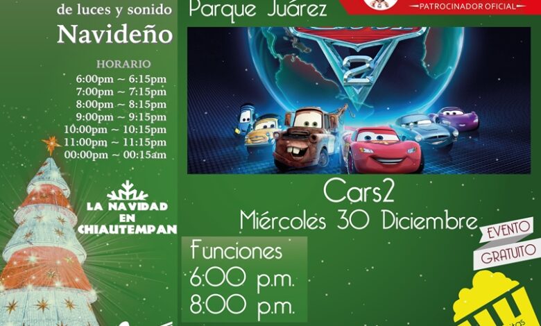 Como parte de las actividades programadas para “La navidad en Chiautempan”, el ayuntamiento de Chiautempan y Grupo textil Providencia invitan al público en general a acudir hoy miércoles 30 de diciembre a la proyección de la película “Cars 2” como parte del ciclo de películas de Disney que se estarán presentando a un costado del Parque Juárez de la ciudad Chiautempense todos los días de manera gratuita en horarios de 6:00 p.m. y 8:00 p.m. y fines de semana una matiné adicional a las 13:00 Hrs.