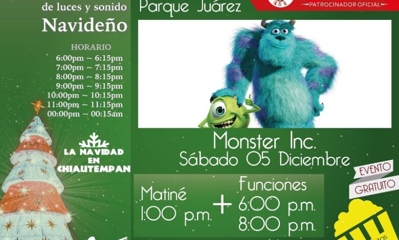 Como parte de las actividades programadas para “La navidad en Chiautempan”, el ayuntamiento de Chiautempan y Grupo textil Providencia invitan al público en general a acudir hoy sábado 05 de diciembre a la proyección de la película “Monsters Inc.” como parte del ciclo de películas de la casa Disney que se estarán presentando a un costado del Parque Juárez de la ciudad Chiautempense todos los días de manera gratuita en horarios de 6:00 p.m. y 8:00 p.m. y fines de semana una matiné adicional a las 13:00 Hrs.