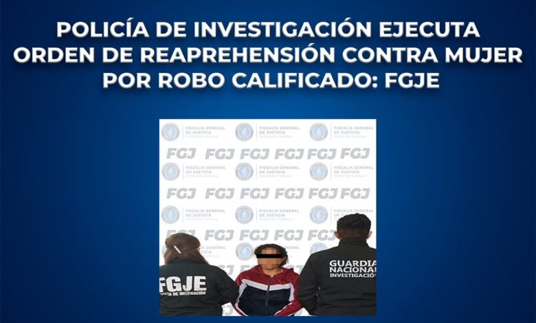 Agentes de la Policía de Investigación de la Fiscalía General de Justicia del Estado (FGJE) ejecutaron una orden de reaprehensión en contra de Guadalupe N., por el incumplimiento de las medidas cautelares impuestas dentro del proceso penal que enfrenta por el delito de robo calificado.