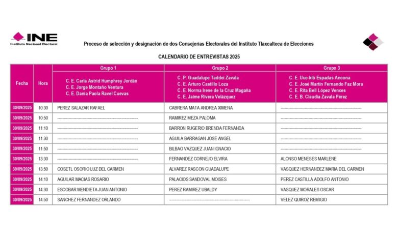 De igual manera, en el micrositio del INE fue publicado el calendario de entrevistas que sustentarán las y los aspirantes cuya fecha está marcada para el 30 de septiembre a partir de las 10:30 y hasta las 14:50 horas, en tres grupos integrados por las y los Consejeros Electorales del INE.