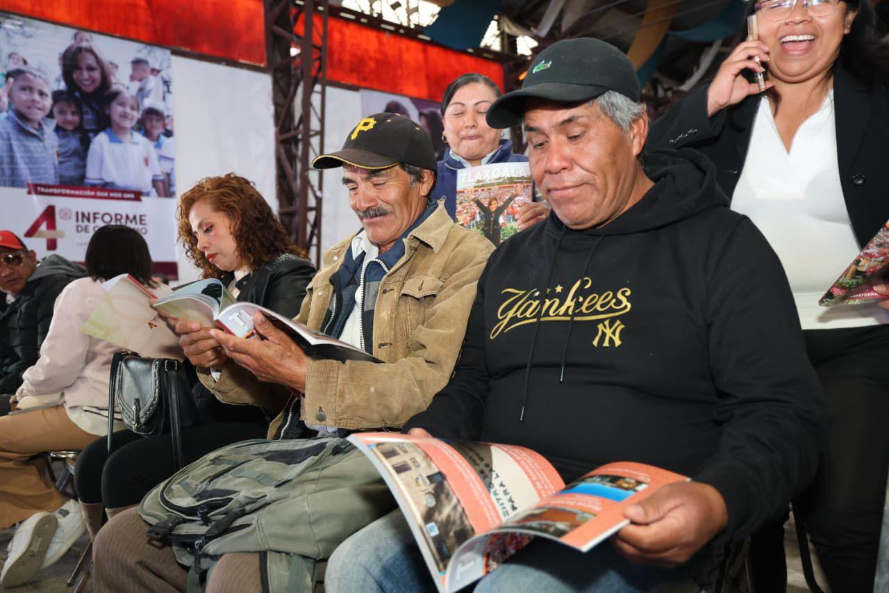 Señaló que 140 mil personas superaron la pobreza alimentaria, se sirvieron más de 2 millones de comidas calientes en 12 Unidades de Nutrición y 7 mil 336 jefas de familia reciben mil pesos mensuales a través de la tarjeta de abasto. Informó además que se han brindado 5.2 millones de servicios médicos gratuitos, se invirtieron 856 millones de pesos en 58 mil acciones de vivienda que beneficiaron a 226 mil personas y que hoy Tlaxcala es segundo lugar nacional en acceso al agua potable (99.31 por ciento) y quinto en electrificación (99.86 por ciento).