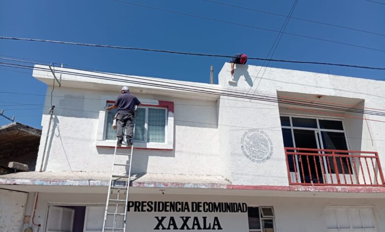 Cómo parte de la imagen y conservación del inmueble que ocupa las oficinas de la presidencia de comunidad de Xaxala, la presidenta Julia Aguilar aguatzi, pinta la fachada de la segunda planta del edificio ya que presenta desgaste del exterior.