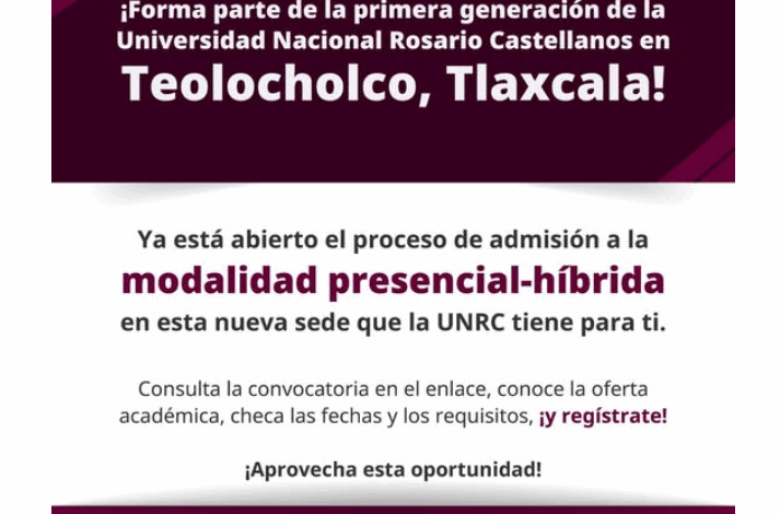 El perfil oficial de la Universidad Nacional Rosario Castellanos en la red social Facebook, anuncia la convocatoria para el ingreso de aspirantes a la Unidad Académica Estatal de Teolocholco, Tlaxcala; sin embargo, la liga conduce a una página “no encontrada”.
