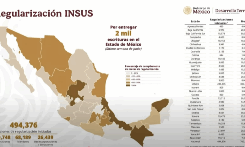 El Instituto Nacional de Suelo Sustentable (INSUS) emitirá durante este 2025 un total de 120 mil escrituras de tenencia de la tierra en todo el país, de una meta sexenal de un millón de documentos de ese tipo.
