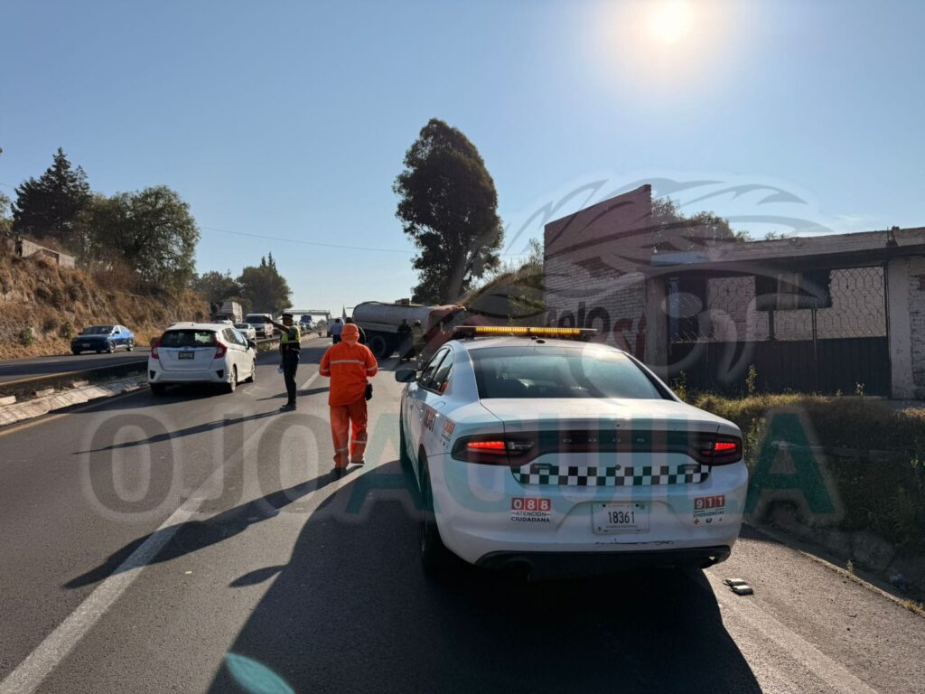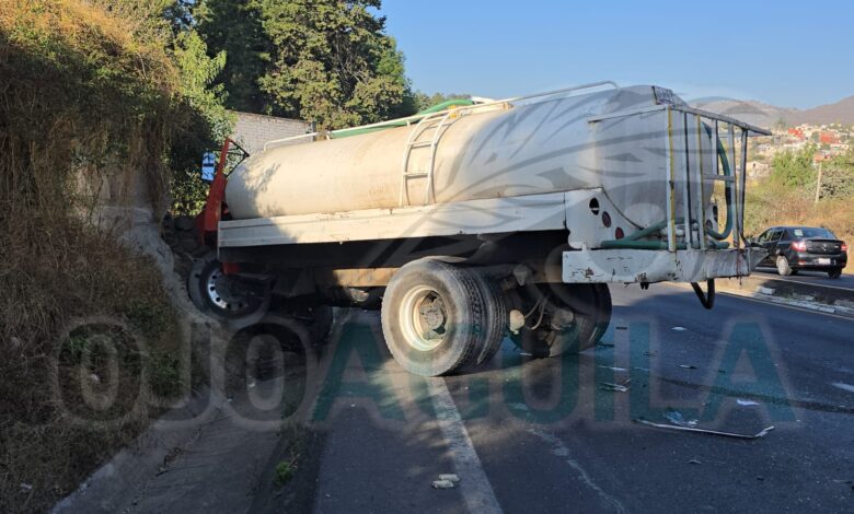 Tlaxcala, Tlax., — Un aparatoso accidente se registró hoy sobre la carretera Tlaxcala–Apizaco, a la altura de la comunidad de Tizatlán, luego de que una pipa de agua perdiera el control, cruzara el camellón central e impactara a un vehículo particular, lo que generó severas afectaciones a la circulación.