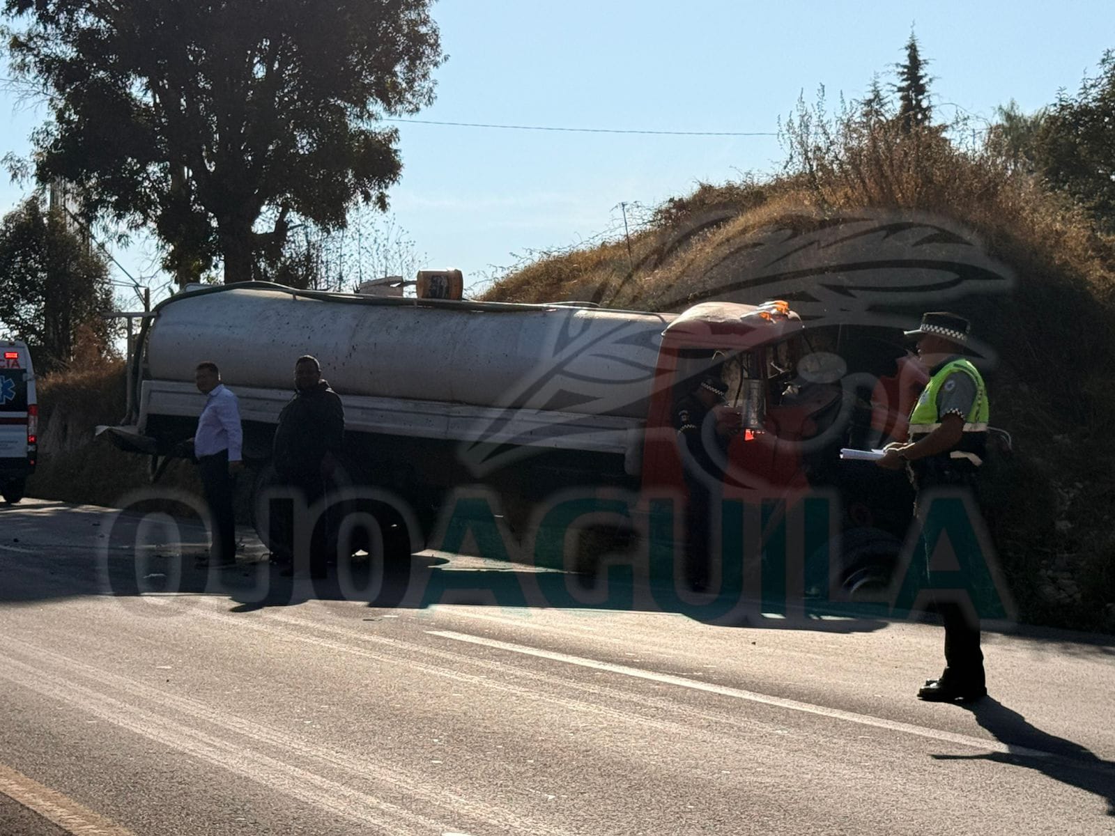 En su trayectoria, la pipa embistió el costado izquierdo de un automóvil eléctrico marca BYD, color blanco, que se dirigía hacia Apizaco, para finalmente impactarse contra un talud de tierra. Tras el percance, el operador de la unidad responsable abandonó el vehículo y huyó a pie del lugar.