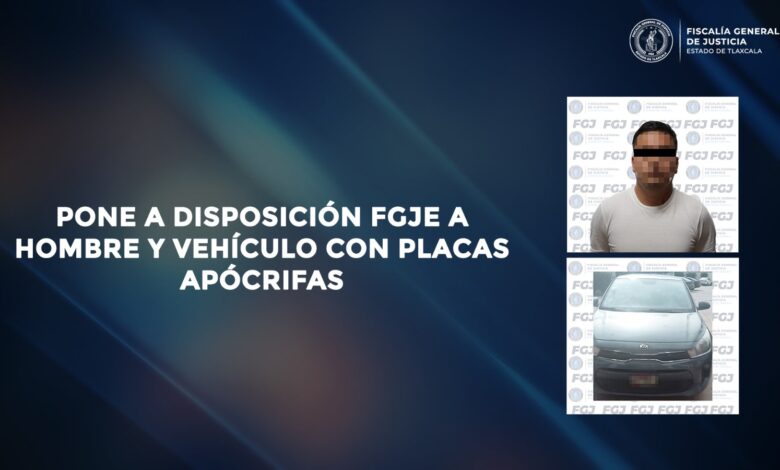 Elementos de la Policía de Investigación de la Fiscalía General de Justicia del Estado (FGJE) pusieron a disposición a Joan Edgar N., así como un vehículo marca Kia, tipo Sedán, modelo 2021, por el probable uso indebido de placas.