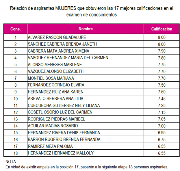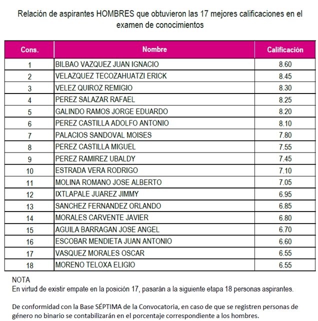 Conforme a las bases del concurso público, pasan a la siguiente etapa 17 aspirantes mujeres y 17 aspirantes hombres que obtuvieron la mejor calificación, siempre y cuando esta sea igual o mayor a seis y, en caso de empate en la posición número 17, como ocurrió para el estado de Tlaxcala, accedieron las personas aspirantes que se encuentran en este supuesto, sumando una más a cada listado.